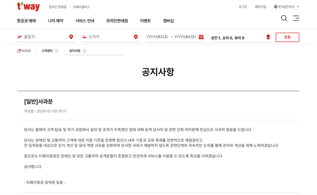 티웨이항공은 1월 5일 자사 공식 홈페이지에 지난 12월 18일 대구공항과 제주공항에서 발생한 티웨이항공의 장애인 차별 사건에 대한 사과문을 게시했다.