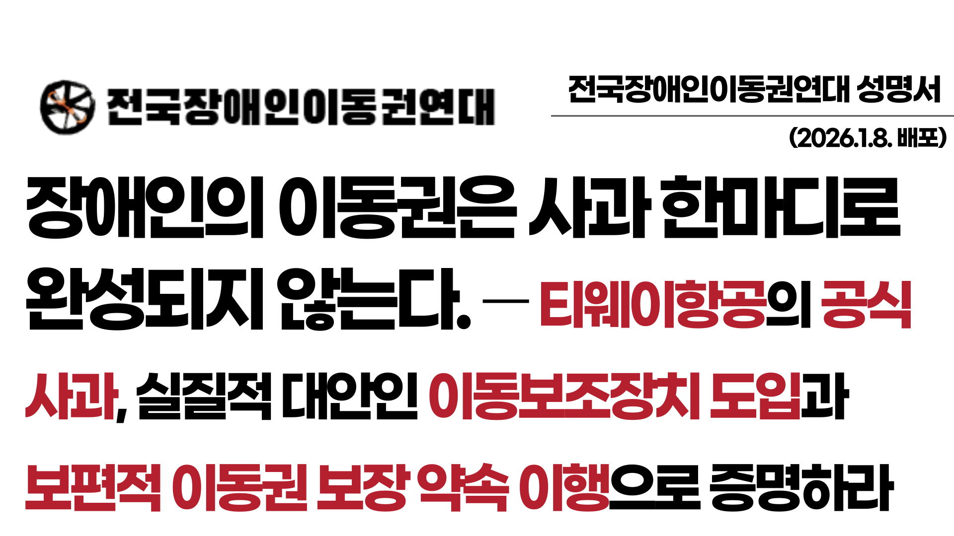 [성명서] 장애인의 이동권은 사과 한마디로 완성되지 않는다. - 티웨이항공의 공식 사과, 실질적 대안인 이동보조장치 도입과 보편적 이동권 보장 약속 이행으로 증명하라 -
